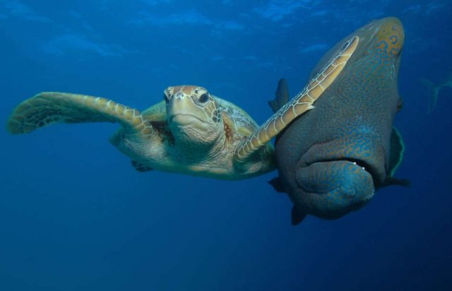 Caption: A Green Turtle vs A Napoleon Maori Wrasse